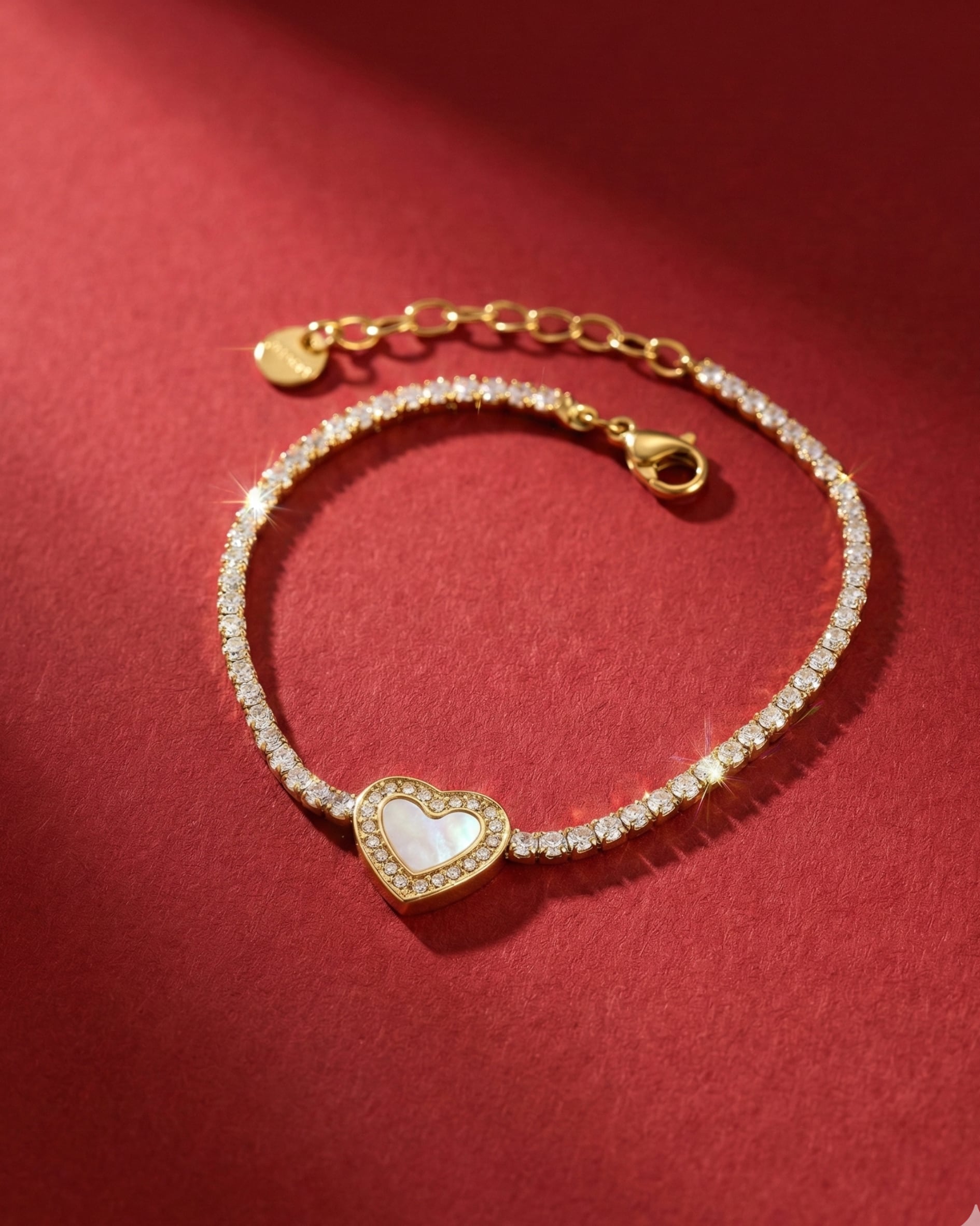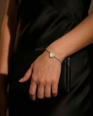 繊細に並ぶジルコニアラインと、マザーオブパールをあしらったハートモチーフが目を引くデザイン。