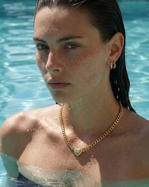 ゴールドのキヘイチェーンに、立体的なハートモチーフをあしらったボリュームチョーカー。