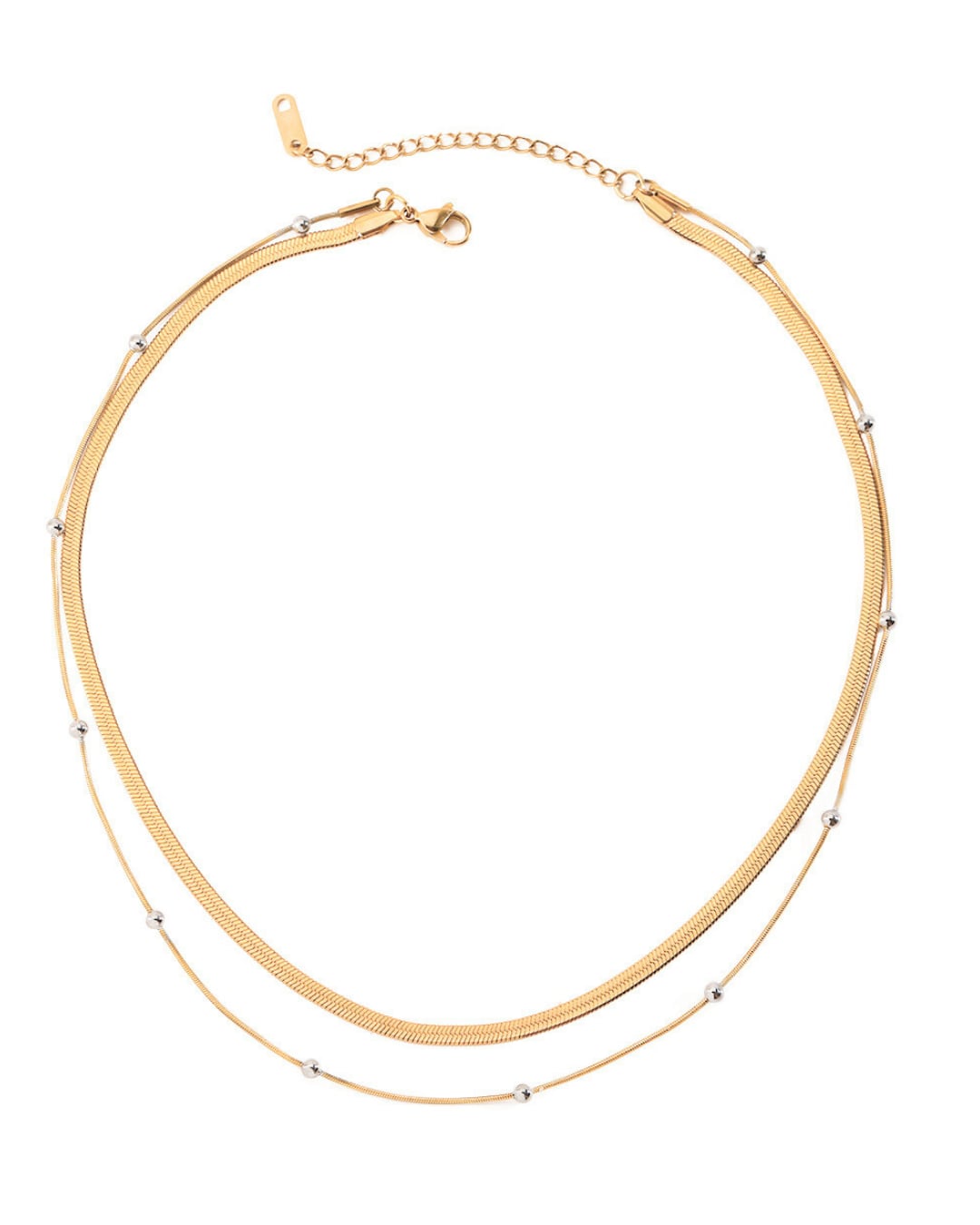 ボール付きチェーンとフラットスネークチェーンを組み合わせた、視線を惹きつける2連ネックレス。異なる質感のコントラストが、シンプルな装いにもさりげない奥行きをプラスします。