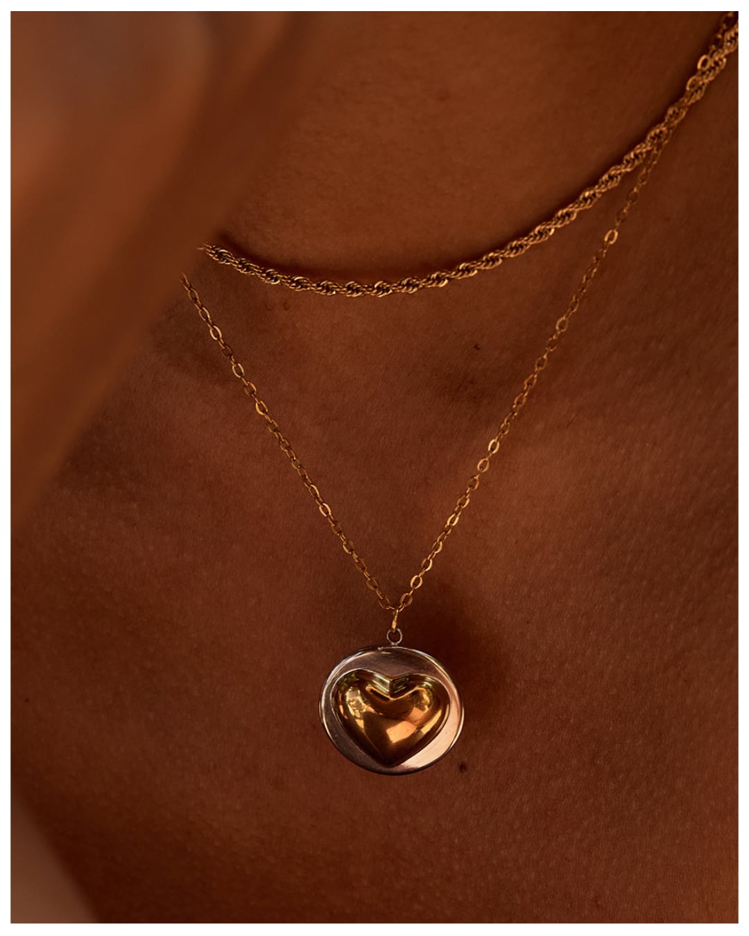 ぷっくりと立体的に仕上げたゴールドのハートを、シルバーフレームで包み込んだペンダントネックレス。ツートーンのコントラストが洗練されたムードを演出し、胸元にさりげなく愛らしさと品を添えてくれます。