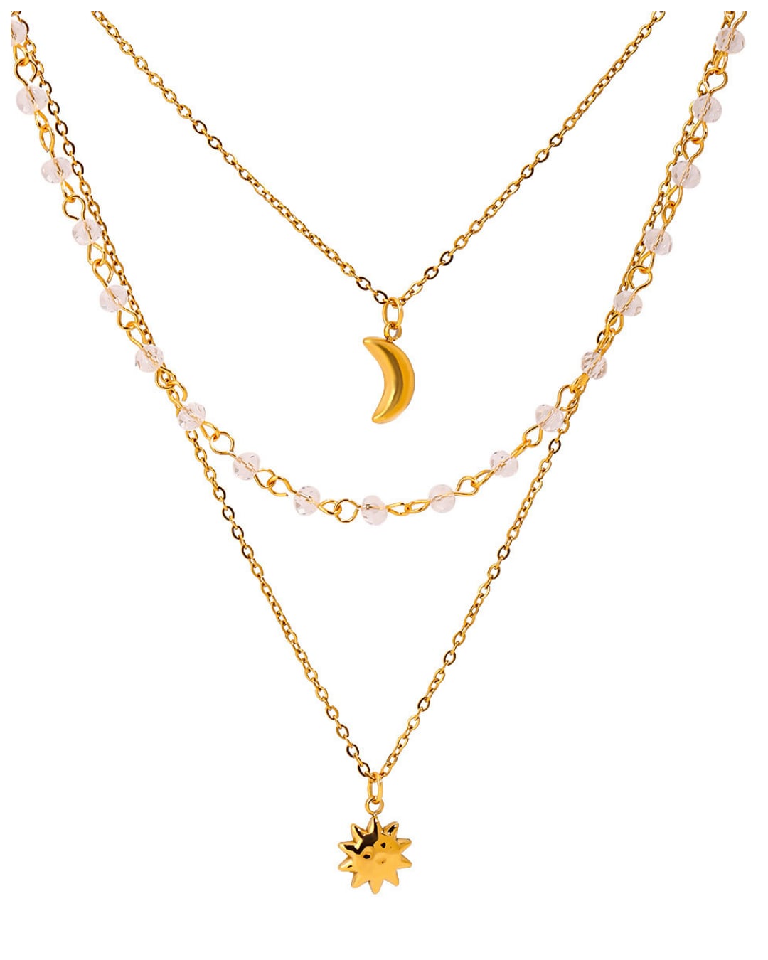繊細なチェーンに、小さなムーンチャームとクリアビーズ、そして太陽モチーフを重ねた立体感のある3連ネックレス。動くたびにきらめき、胸元にロマンティックなストーリーを添えてくれます。程よいボリューム感で、シンプルなトップスもぐっと印象的に。