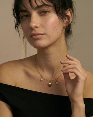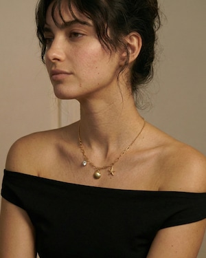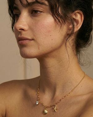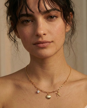 繊細なチェーンに、ヒトデ・シェル・ジルコニアのチャームを重ねた3連ネックレス。海辺のワンシーンを切り取ったような爽やかでナチュラルなデザインが、胸元に透明感を与えます。動くたびにきらりと揺れて、カジュアルにもフェミニンにも自然にマッチ。