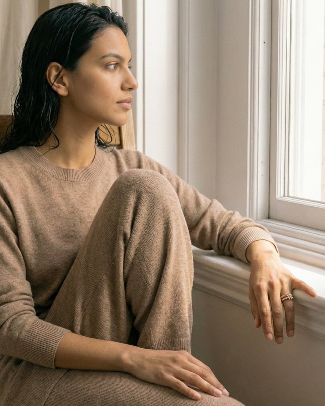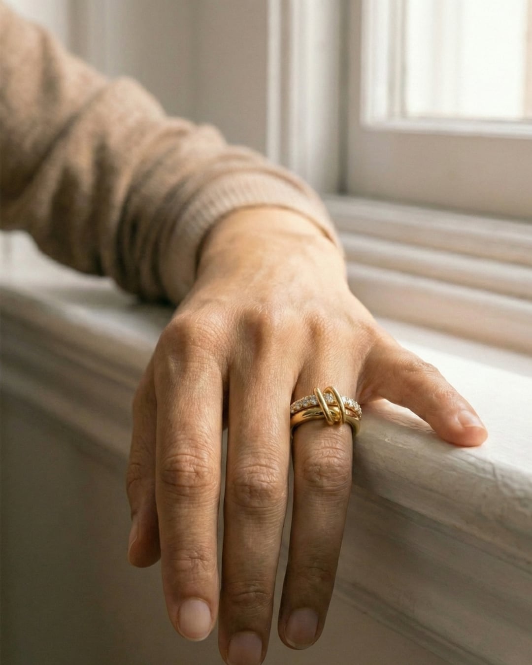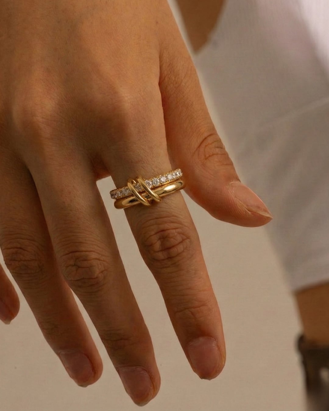 ジルコニアが施された部分が指元に優雅な輝きを与え、もう一方のシンプルなゴールドループが全体のバランスを保つユニークなデザイン。金属アレルギー対応素材を使用しているため、敏感肌の方でも安心して着用いただけます。