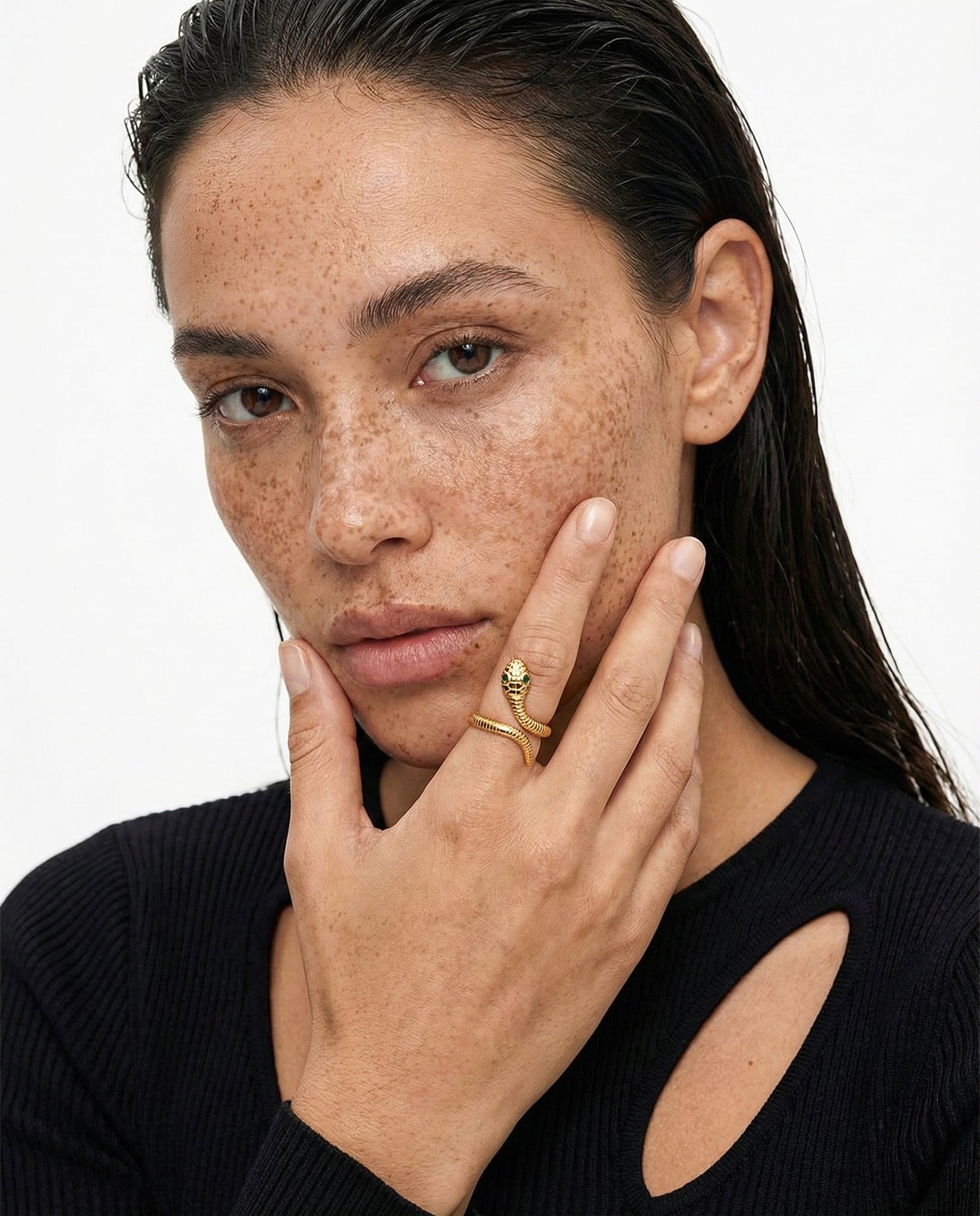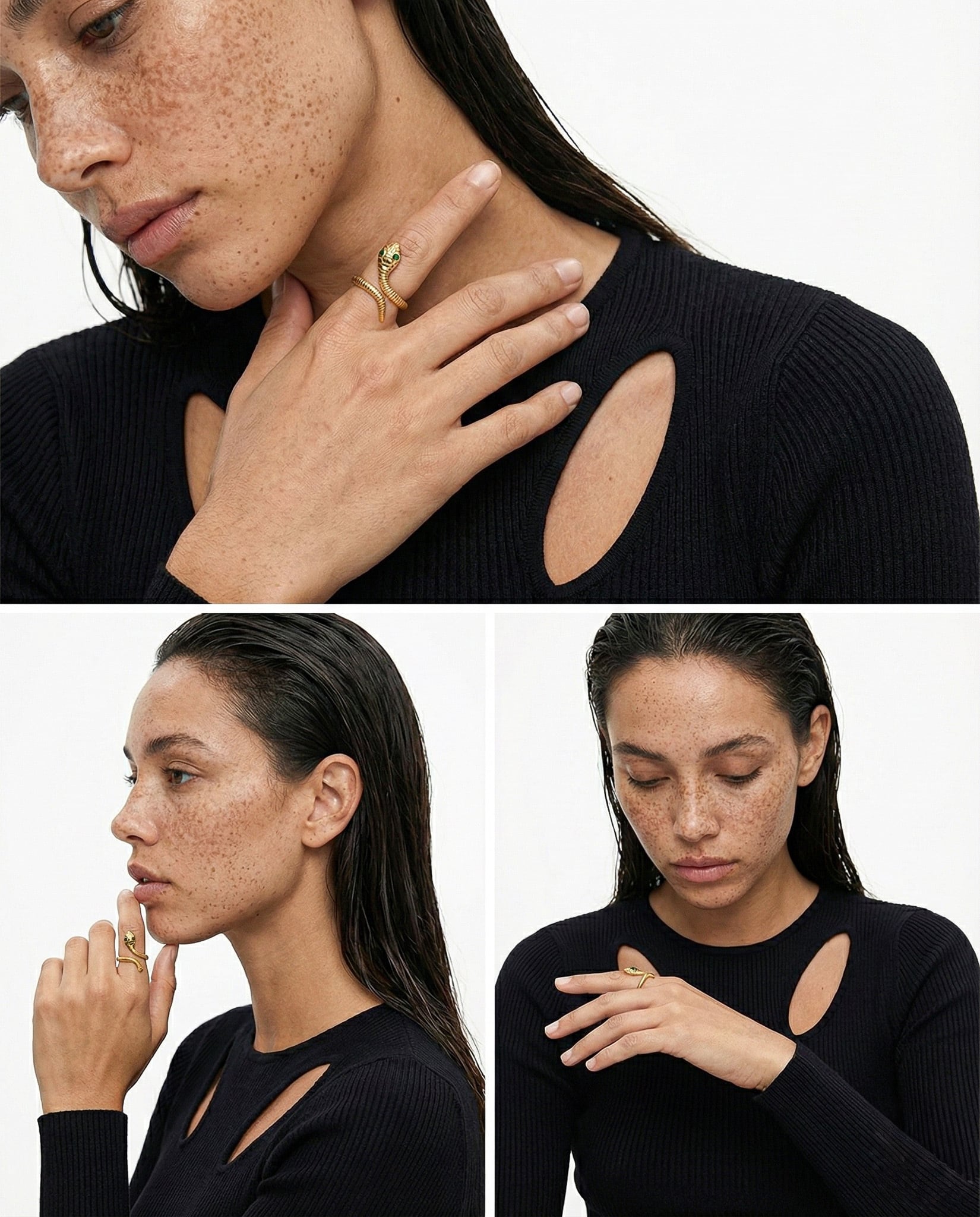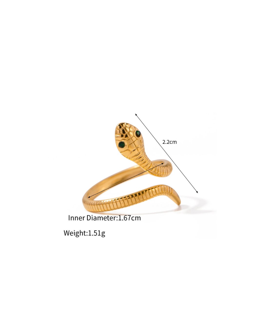 蛇が指に絡みつくようなデザインのリング。鋭い視線を放つグリーンストーンの目が、ミステリアスな雰囲気を演出します。繊細なスケール模様と美しい曲線が、洗練されたエレガンスとワイルドな魅力を兼ね備えています。